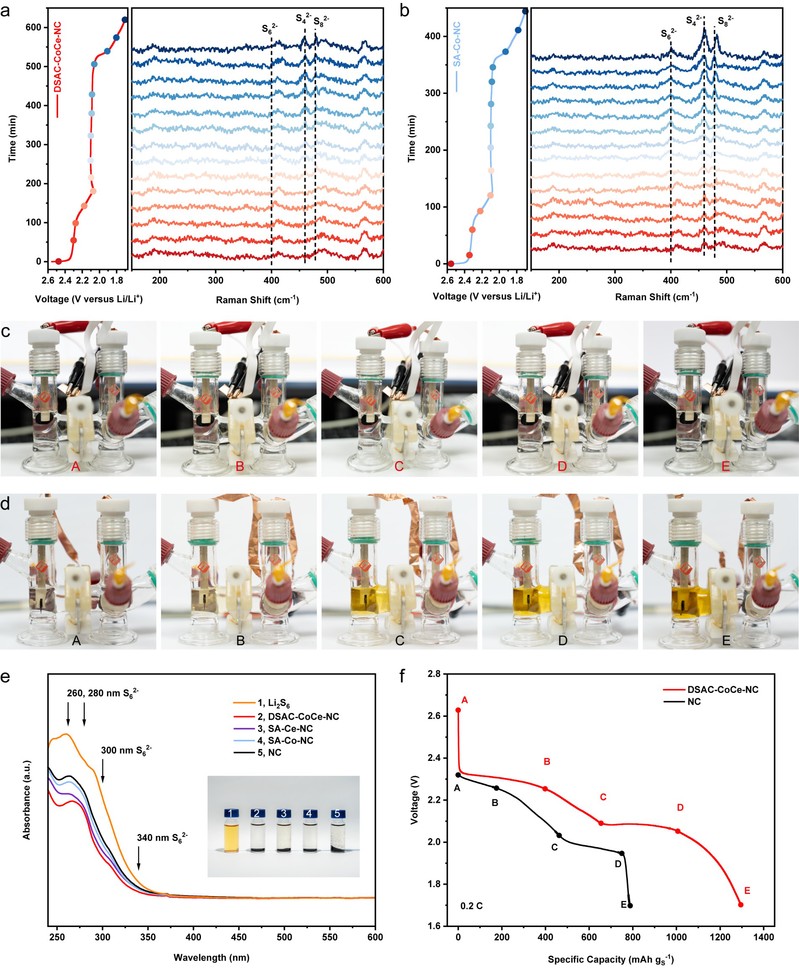 图4. 放电过程中的原位拉曼光谱,首次放电过程的可视化电池图像以及紫外-可见吸收光谱。S@DSAC−CoCe−NC可视电池在整个放电过程中始终保持较高透明度,而S@NC可视电池从无色变为深黄色,这主要源于可溶性长链多硫化锂(LiPS)的扩散;而DSAC−CoCe−NC对该过程具有显著抑制作用,这归因于钴/铈双单原子位点对长链LiPS的有效锚定。