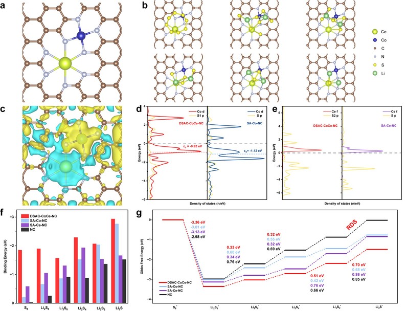 基于密度泛函理论计算,本研究从原子尺度揭示了Co/Ce双单原子的协同作用机制:电子由Ce位点向Co位点转移,诱导Co的d带中心上移,共同增强了催化剂对多硫化物的吸附能力。Ce位点因其对长链多硫化物的强吸附性主导初始捕获,而Co位点则有效催化后续固相Li2S的沉积/解离关键步骤,显著降低了相应反应的吉布斯自由能垒。同时,该双位点结构亦能促进Li⁺传输。综上,Co/Ce通过“吸附-转化”协同机制,抑制多硫化物穿梭并加速反应动力学,从而显著提升锂硫电池性能。