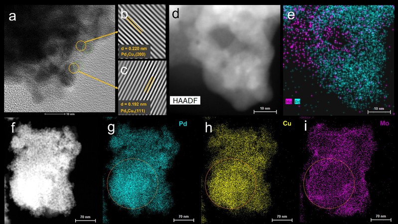图2、 (a-c) PdCu-MoOx的高分辨透射电子显微镜(HRTEM)图像,(d, f) 高角环形暗场(HAADF)图像,以及(e和g-i) 元素分布图,展示了Pd、Cu和Mo的元素分布。