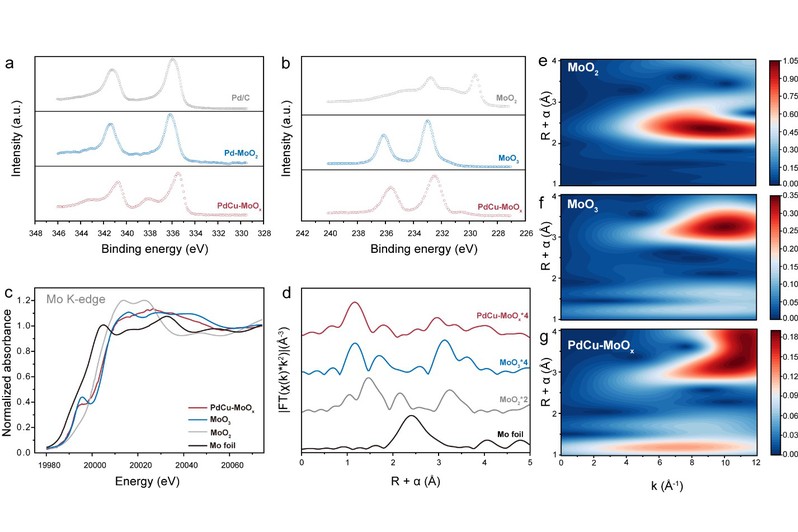图3、(a) Pd/C、Pd-MoO2及 PdCu-MoOx的Pd3d结合能X-射线光电子能谱(XPS)图;(b)MoO2、MoO3及 PdCu-MoOx的Mo3d结合能XPS图;(c) Mofoil、MoO2、MoO3及 PdCu-MoOx的MoK边XANES谱图;(d) Mofoil、MoO2、MoO3及 PdCu-MoOx的扩展 X-射线吸收精细结构(EXAFS)谱的傅里叶变换k2加权χ(k)函数图;(e) MoO2的k2加权 EXAFS信号小波变换图;(f) MoO3的k2加权EXAFS信号小波变换图;(g) PdCu-MoOx的k2加权EXAFS信号小波变换图。