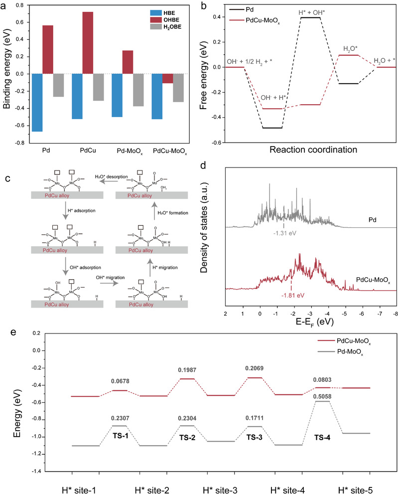 图5、(a)Pd、PdCu、Pd-MoOx和PdCu-MoOx催化剂上H*和OH*的吸附能。(b)Pd和PdCu-MoOx催化剂上反应路径的吉布斯自由能曲线。(c)PdCu-MoOx催化剂上HOR的反应路径(从H*的吸附、OH*的吸附,到中间体(H*和OH*)的迁移,接着是H2O的形成,最后是H2O*的脱附)。(d)Pd和PdCu-MoOx催化剂的d带中心。(e)Pd-MoOx和PdCu-MoOx从H*位点1到H*位点5的氢迁移结合能和过渡态能量。