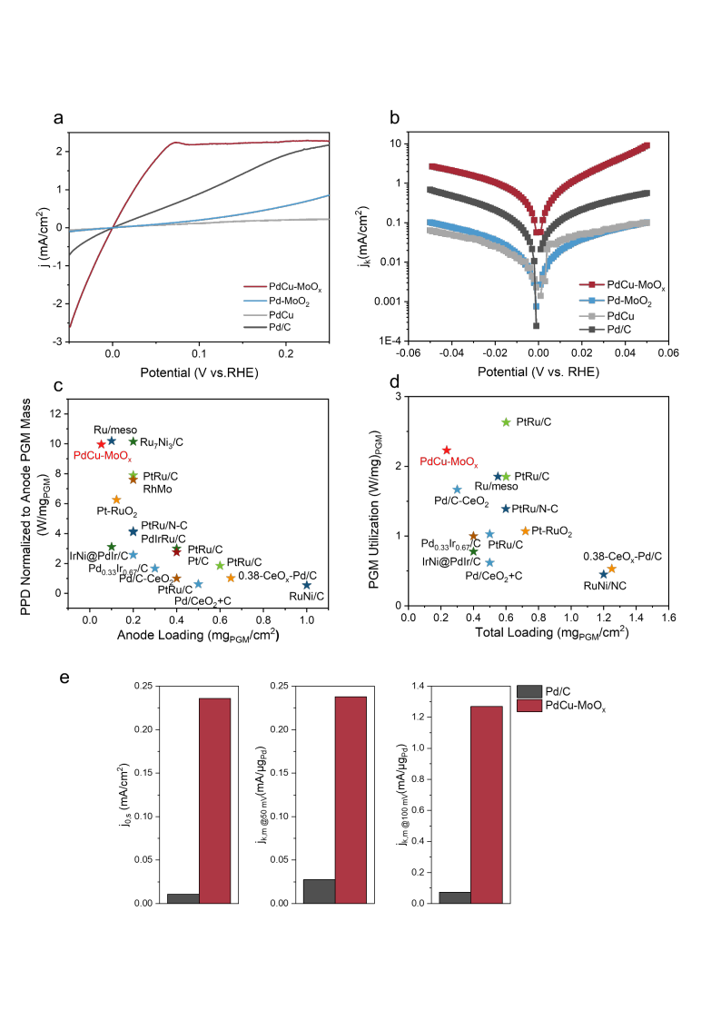 图4、(a) Pd、PdCu、Pd-MoO2及 PdCu-MoOx的HOR极化曲线;(b) 由(a)计算得到的HOR动力学电流密度图;(c) AEMFCs的峰值功率密度归一化至阳极贵金属(PGM)负载的性能对比(进料气体为H2-O2);(d)AEMFC的峰值功率密度归一化至总贵金属负载的性能对比(进料气体为H2-O2);(e) PdCu-MoOx与Pd/C的电化学活性面积归一化的交换电流密度(j0,s)、50 mV过电位下的质量归一化动力学电流密度(jk,m)及100 mV过电位下的质量比动力学电流密度(jk,m)。