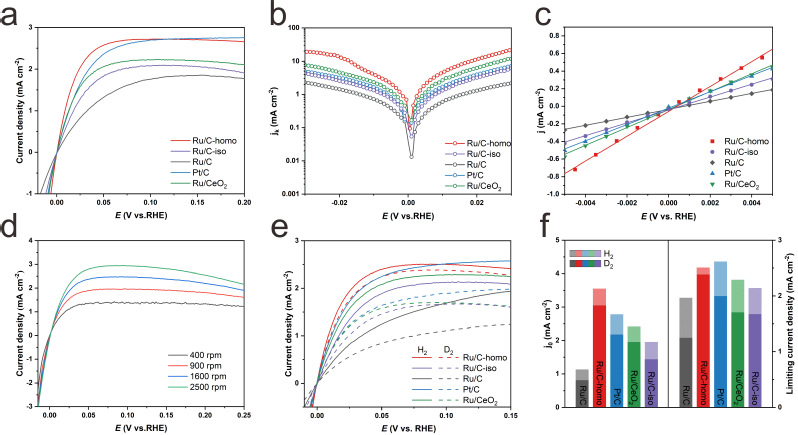 在 H2饱和的 0.1 M KOH 中,Ru/C-homo 在较低过电位下即可达到扩散限制电流密度,其动力学电流密度与交换电流密度均明显优于 Pt/C、Ru/C、Ru/C-iso 及 Ru/CeO2。