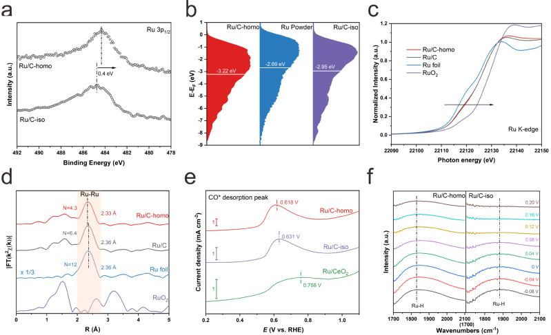XPS 与 UPS 测试结果显示,Ru/C-homo 中 Ru 的结合能与 d 带中心相较 Ru/C-iso 出现系统性变化,表明晶界结构对 Ru 的电子结构产生了明显调控。EXAFS 拟合结果进一步证实,Ru/C-homo 中 Ru–Ru 配位数明显降低,Ru–Ru键键长变短,这与晶界处的原子空位和压缩效应相一致。这种结构特征对中间体吸附行为产生了直接影响。CO stripping 与原位 Raman 结果表明,Ru/C-homo 对 OH* 的吸附能力相较对照样品有所增强, 原位 FTIR 测试显示,Ru/C-homo 中 Ru–H 振动峰相较 Ru/C-iso 出现明显红移,表明 HBE 得到一定程度的削弱。