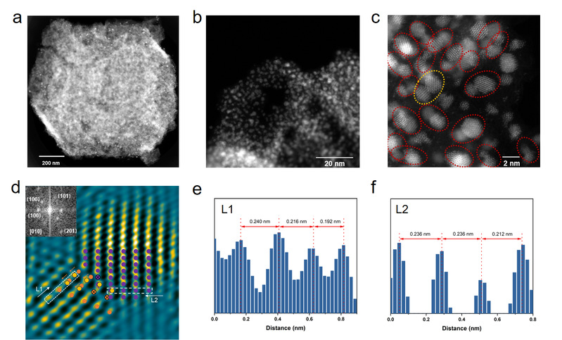 原子分辨图像清晰揭示了晶界区域存在的原子位移、空位与位错结构。进一步的 XRD、EXAFS 与 GPA 分析表明,这些晶界区域伴随明显的晶格压缩,应变主要集中在 Ru–Ru 接触界面附近。相比之下,对照样品 Ru/C-iso 中 Ru 纳米颗粒多为孤立分布,缺乏明显的晶界结构。
