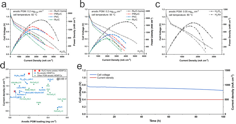 在 AEMFC 器件测试中,以 Ru/C-homo 作为阳极催化剂的单电池在 H2/O2条件下获得了1.81 W cm-2的峰值功率密度,整体性能优于 Pt/C 与 PtRu/C 对照体系。在 H2/air 条件下,其性能优势仍然保持。在降低贵金属负载量的情况下,该体系仍能维持较高的质量功率密度,并在长时间恒流运行中表现出良好的电压稳定性,表明该结构在器件层面具备应用价值。